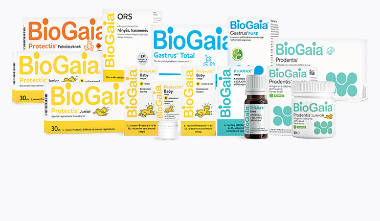 Étrend-kiegészítő rágótabletták, egyedülálló módon L. reuteri Protectis® (DSM17938) élőflórával. Eper és narancs ízben, sima és D-vitaminos változatban.